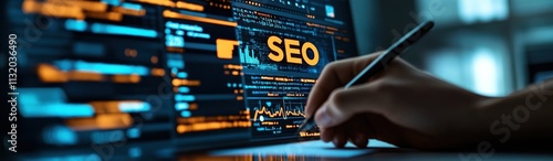 © milenialdesastudio, Obraz premium A hand writing on a digital screen displaying SEO analytics and data.