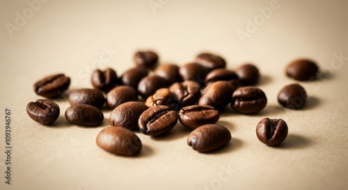 Naklejka premium A handful of coffee beans scattered across a pale beige backdrop