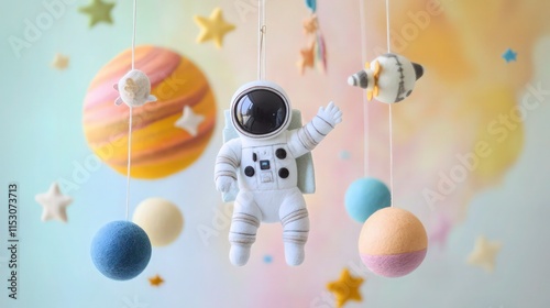 Naklejka premium A handmade baby crib mobile featuring an astronaut crafted from soft, organic...