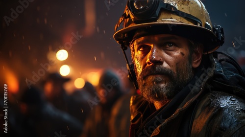 Obraz premium A handsome male firefighter stands against a background of flames in dirty firefighting clothing. Close-up of a man looking at the cameras.