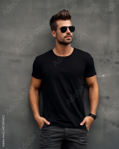 © Leli, Naklejka premium A handsome male model stands in front of a grey wall wearing a black t-shirt
