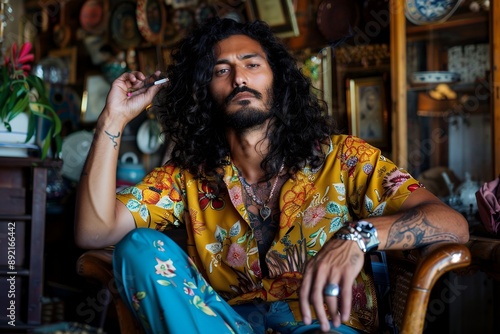© Sourav Mittal, Obraz premium A handsome mixed race man with long curly hair and a beard, sitting in an antique store wearing a colorful shirt with a yellow floral pattern, smoking a cigarette, in a relaxed pose, looking up at the