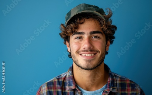 © imagineRbc, Fototapeta premium A handsome young man with brown hair and a beard smiles at the camera. He is wearing a white t-shirt and is standing against a blue background