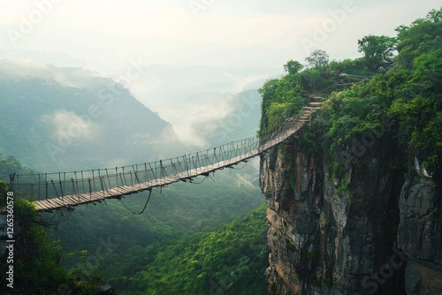Fototapeta premium A hanging bridge across a dangerous cliff, symbolize challenge in life