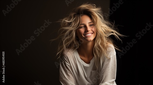 Fototapeta premium a happy attractive young woman with long blonde hair over dark background