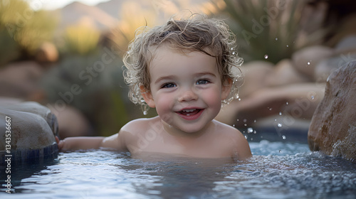 © TUL, Obraz premium A happy baby joyfully splashing water in a bright sunlit pool creating moments of pure joy and innocence in a summer setting.