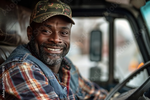 © SH Design, Fototapeta premium A happy black truck driver sitting in the cab of his vehicle