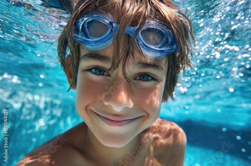 Naklejka premium a happy boy swimming in the pool, wearing goggles and swim trunks, swimming...
