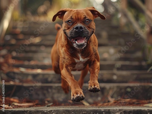 Fototapeta premium A happy brown dog is running up a flight of stairs
