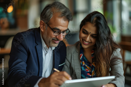 © AI_images, Fototapeta premium A happy business duo consisting of an Indian woman and a Japanese man, actively working with a digital tablet to discuss financial market data during a corporate office meeting.