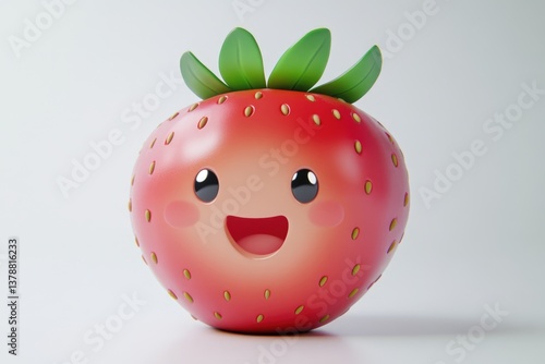 © Anjali, Obraz premium A happy cartoon strawberry with a smiling face and green leaves.