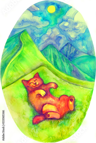 © Xenta Rain, Naklejka premium A happy cat lies and basks on the lawn in the sun against the backdrop of mountains and a peaceful landscape