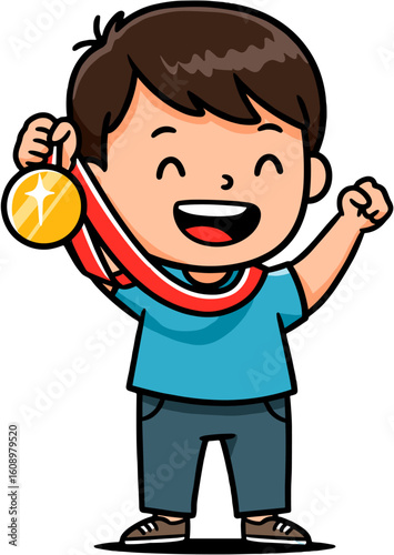 © Felippe Lopes, Obraz premium A happy child celebrating victory with a gold medal.