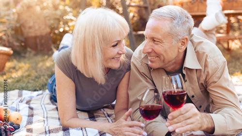 © Prostock-studio, Fototapeta premium A happy couple lies on a blanket in a garden, sharing a joyful moment over glasses of red wine. They smile at each other, surrounded by fruits and a peaceful outdoor setting.