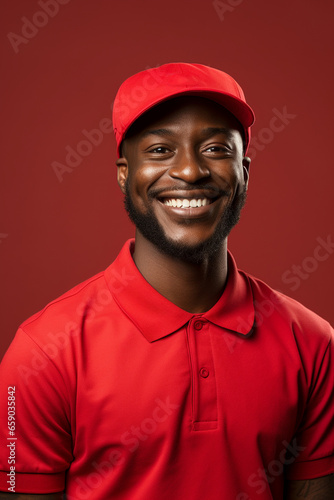 © Enrique, Fototapeta premium A happy deliveryman smiling, Bright solid light red background