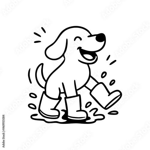 Obraz premium A happy dog in tiny rain boots hopping through puddles, tail up, with playful...
