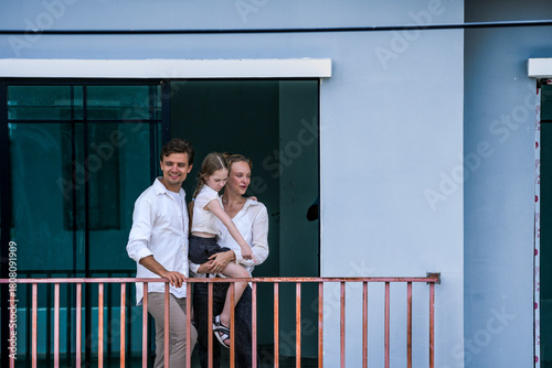 Obraz premium A happy family of three shares a loving moment on the balcony of their modern...