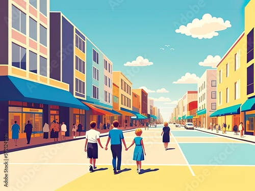 Obraz premium A happy family walking in the downtown. Generative Ai