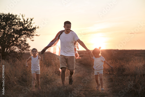 © puhimec, Fototapeta premium A happy family with an American flag at sunset.