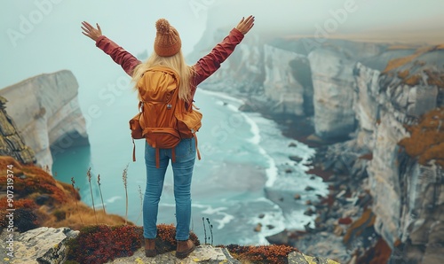 © Igal, Obraz premium A happy female hiker is standing on a cliff with her arms up in the air, feeling exhilarated and free.