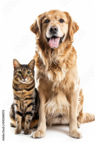 © Alberto Gonzalez , Fototapeta premium A happy German Shepherd dog and a tabby cat lying together, both looking directly at the camera.