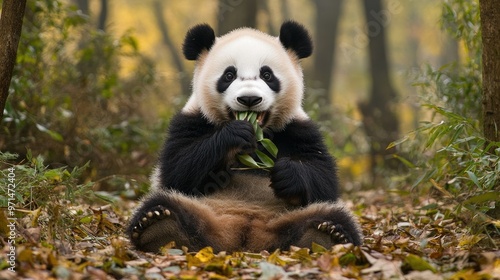 Fototapeta premium A happy giant panda sits on the ground, chewing green bamboo leaves in a park, surrounded by fallen leaves. The panda looks peaceful and content in its natural environment