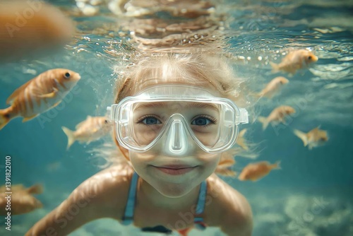 © detiyy, Fototapeta premium A happy girl smiles while snorkeling underwater surrounded by tropical fish. Perfect for travel brochures or summer vacation themes.