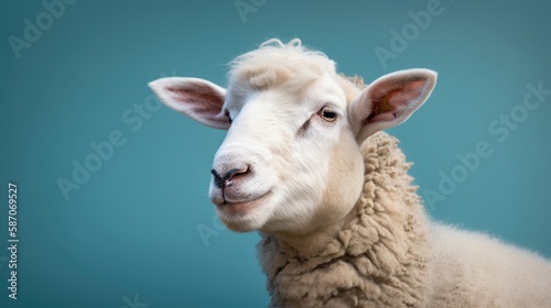 © Creative Station, Fototapeta premium A happy lamb - portrait on a blue background, generative ai
