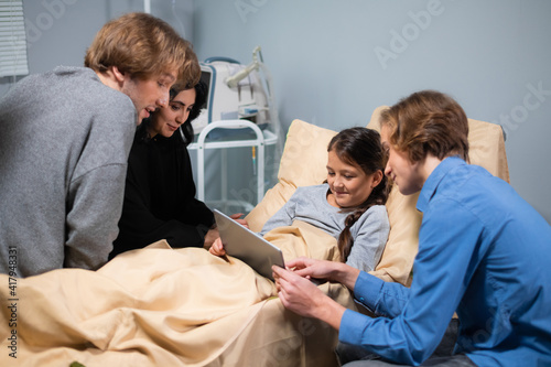 © Anna Kosolapova, Fototapeta premium A happy little girl learning to use a tablet while she is staying in a hospital, her brother is helping her figure things out.