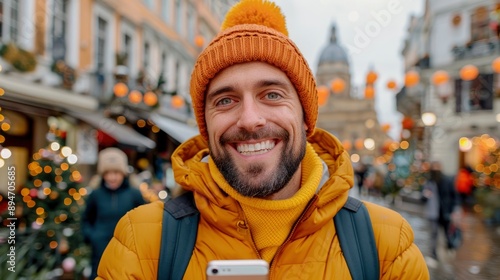 © IMPic, Obraz premium A Happy Male Tourist, Taking A Photo With His Cell Phone On The Street At Night