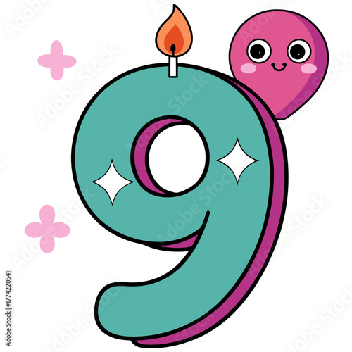 © Hakim, Obraz premium A happy number nine birthday candle with a cute balloon