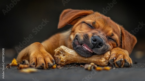 © Tri, Fototapeta premium A happy puppy sleeps contentedly with a bone, showcasing joy and relaxation.