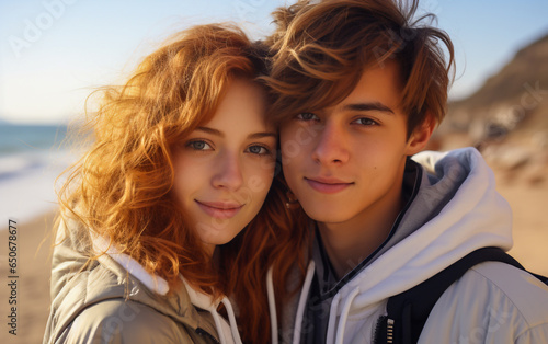 Obraz premium A happy romantic teen couple hug on the beach in a sunny day