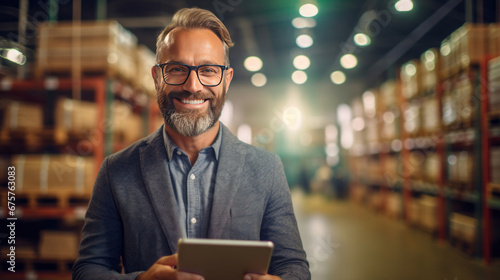 Fototapeta premium A happy salesman stand holding tablet in large warehouse.