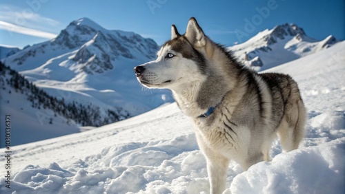 Naklejka premium A happy Siberian Husky in a winter wonderland, with snow-covered peaks and...
