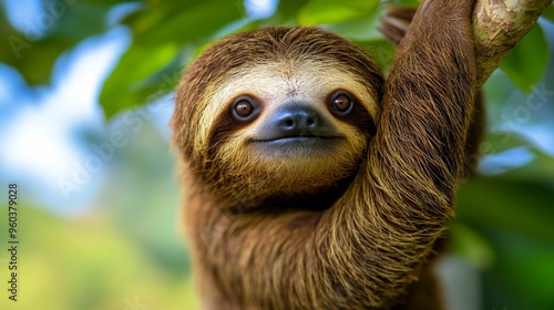 Fototapeta premium A happy sloth hangs from a tree branch, lazily smiling at the world around it.