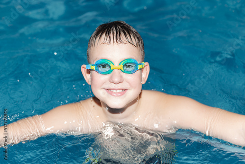 Naklejka premium A happy smiling boy swims in the sea. Healthy lifestyle. Swimming. Sports and...