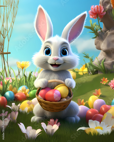 © Orkidia, Obraz premium A happy smiling Easter Bunny and colorful easter eggs