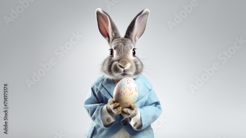 © Katya, Obraz premium A happy smiling Easter bunny in a jacket holds a large egg in his hands