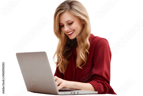 © MstSuborna, Naklejka premium A happy woman in a red shirt sitting at her laptop computer, transparent background