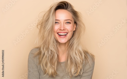 © Sergey Fedchenko, Fototapeta premium A happy woman with ash blonde messy hair, pastel light yellow background