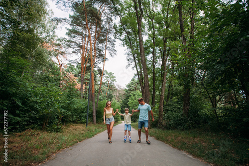 © Ihor, Fototapeta premium A happy young family, dad, mom and son are skating hand in hand with their parents, on roller skates, along a path in the park. The whole family is dressed in shorts and T-shirts.