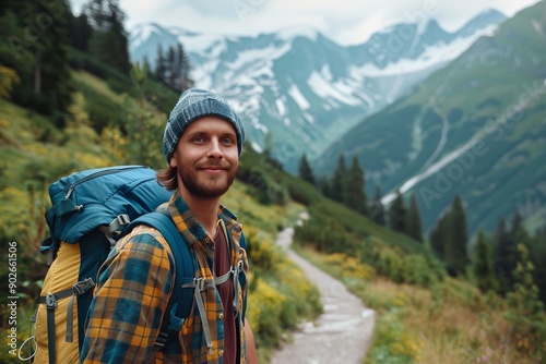 Fototapeta premium A happy young hiker and backpacker enjoying the breathtaking scenery while strolling along a trail, Generative AI.