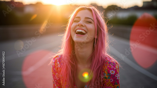 Naklejka premium A happy young woman with bright pink hair, laughing in a sunlit urban setting with a lens flare. This joyful and unique portrait captures a sense of freedom and individuality.