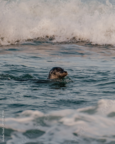 © _mishamartin, Obraz premium A harbor seal swimming in the dynamic glacial waters of Jökulsárlón, Southeast Iceland, surrounded by waves.