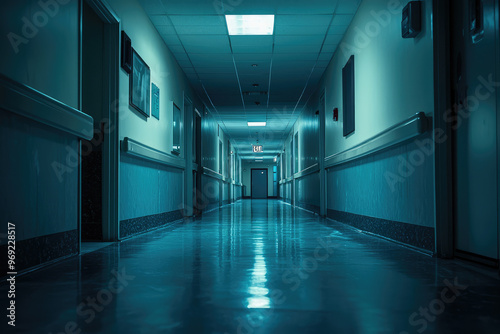 Fototapeta premium A haunted hospital corridor with flickering lights creates an eerie atmosphere