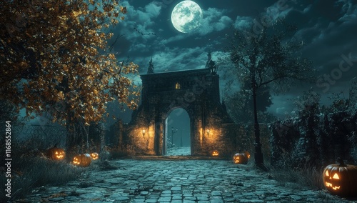 © Nafeesa, Fototapeta premium A haunted house on an old cobblestone street, surrounded by spooky trees and glowing pumpkins