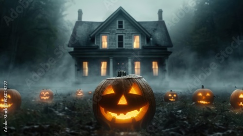 © DuangphonKPR, Naklejka premium A haunted house surrounded by a dense fog, with glowing jack-o'-lanterns leading up to the entrance