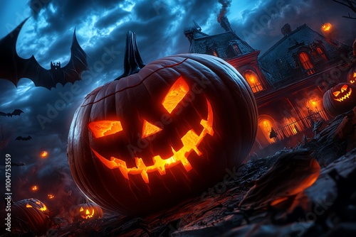 Fototapeta premium A haunted mansion in a fantasy world, where ghostly figures swirl around and magical pumpkins glow with eerie light on Halloween night