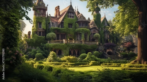 © Cloudyew, Fototapeta premium A haunted mansion with overgrown gardens